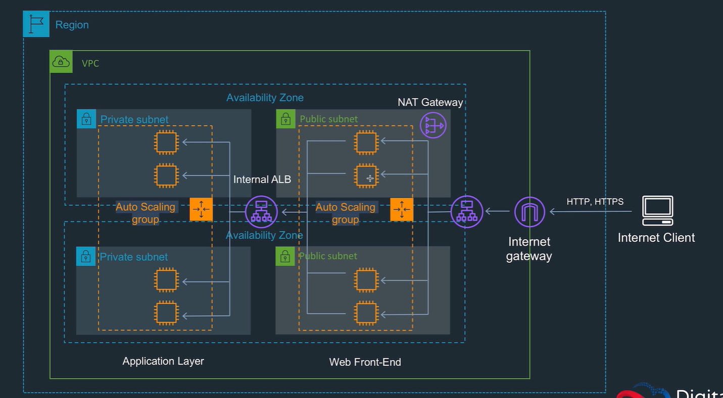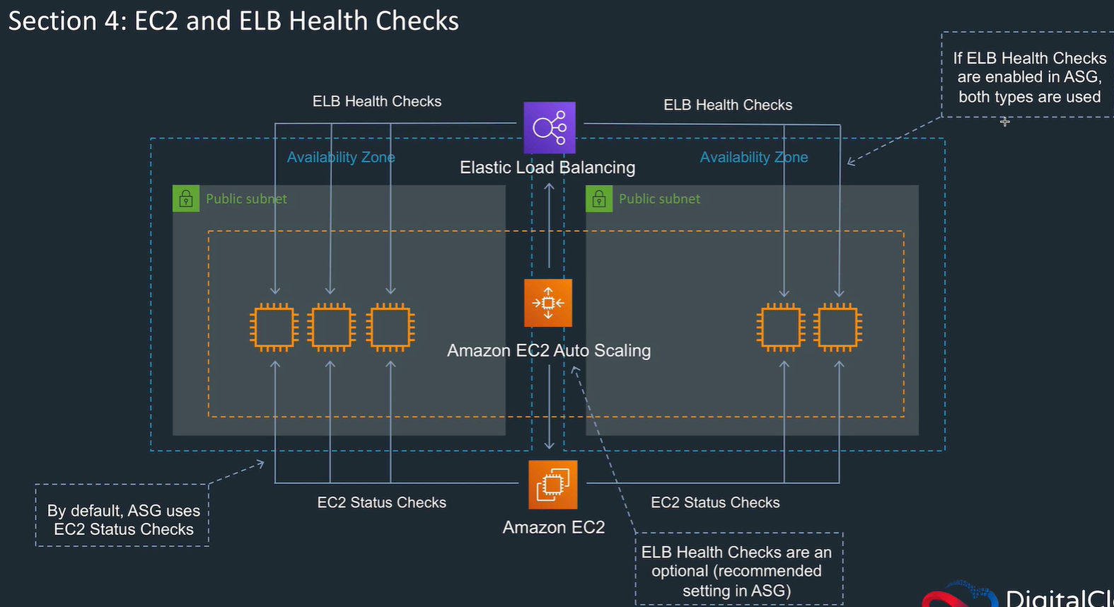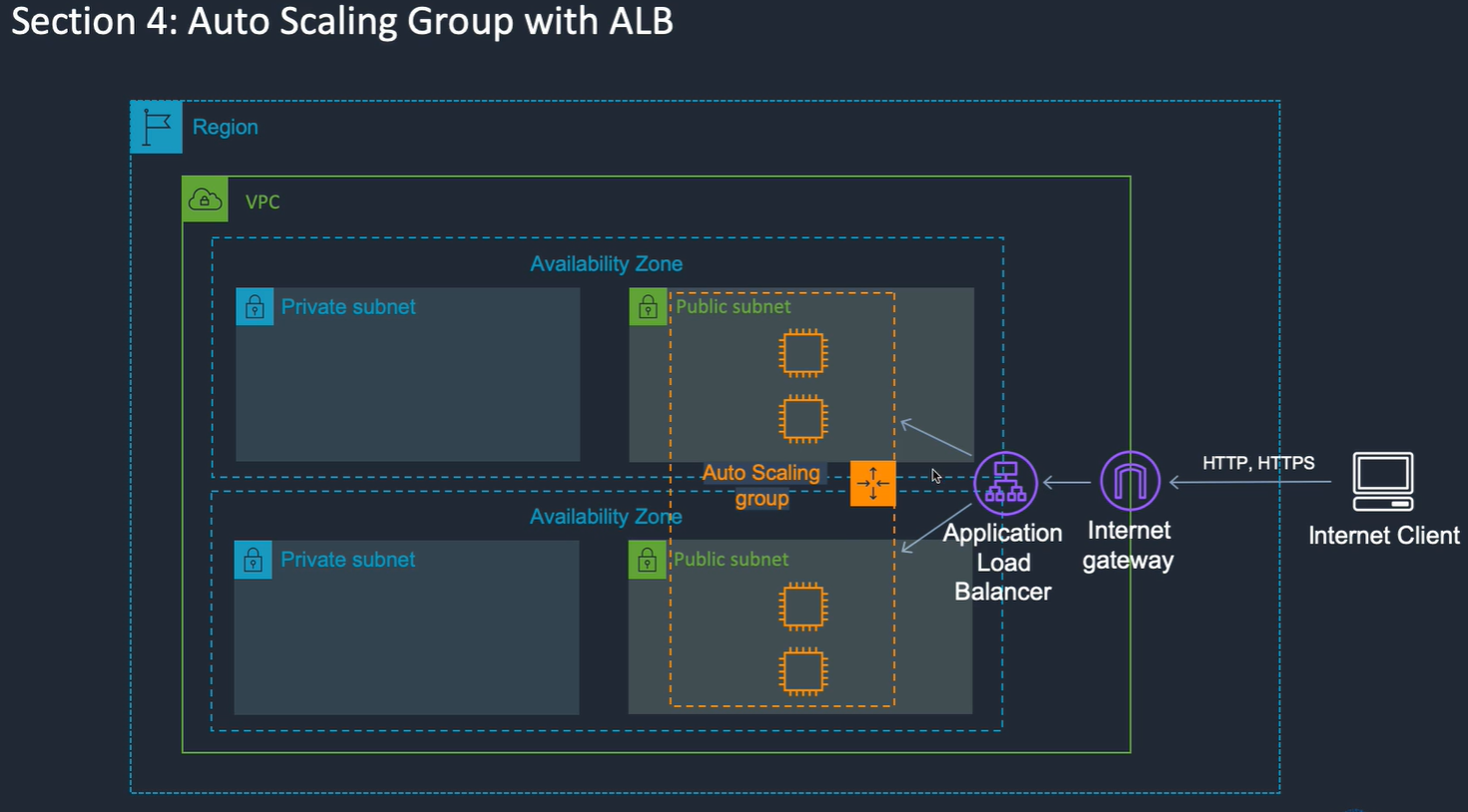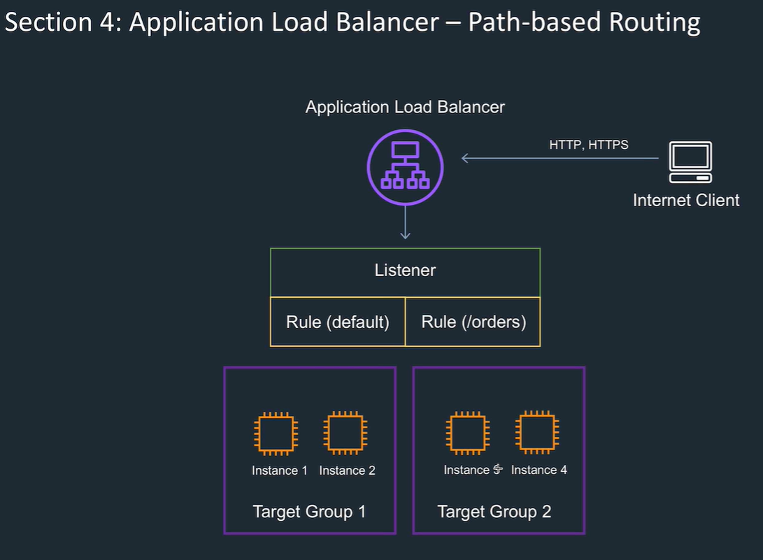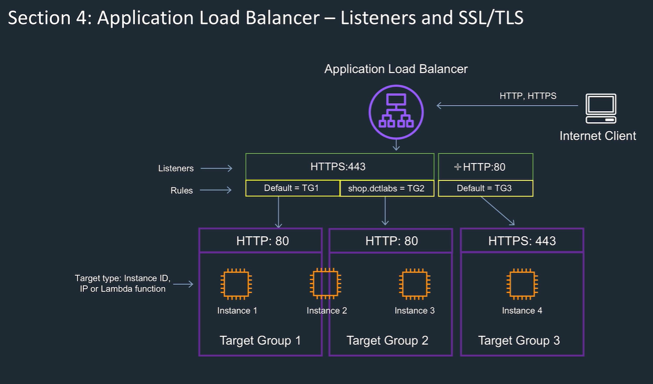 Register instances in target groups Say how many need to be awake Target group is the group of instances that the traffic is distributed to. (this can be an auto scaling set) Can send traffic to different target groups depending on the path or host in the HTTP headers. Can choose to make client sessions round robin / least queue or sticky to a EC2 instance.