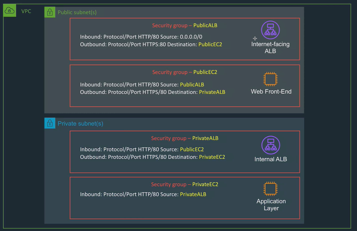 Want ALB to listen on 80 to anything Want EC2 instances in private subnet Best to set up SGs so ALB accepts any traffic on port 80, but only sends to private SG. Instances in private subnet in an SG to only accept traffic from the public SG.