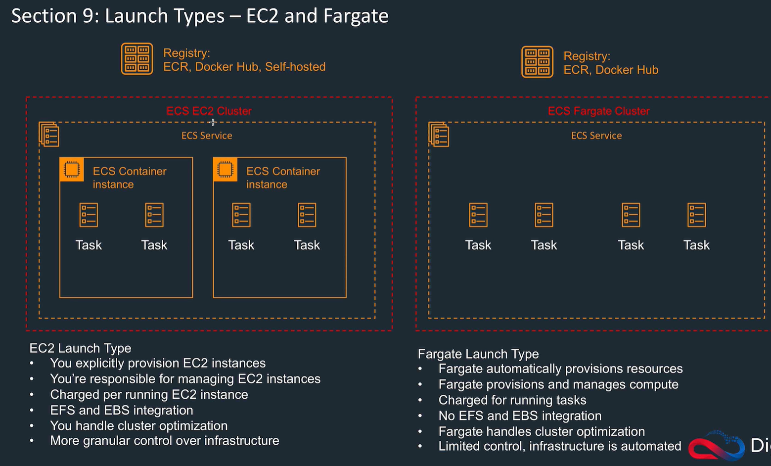 EC2 launch type: Lower level, control EC2, file storage, do teh management, granular control