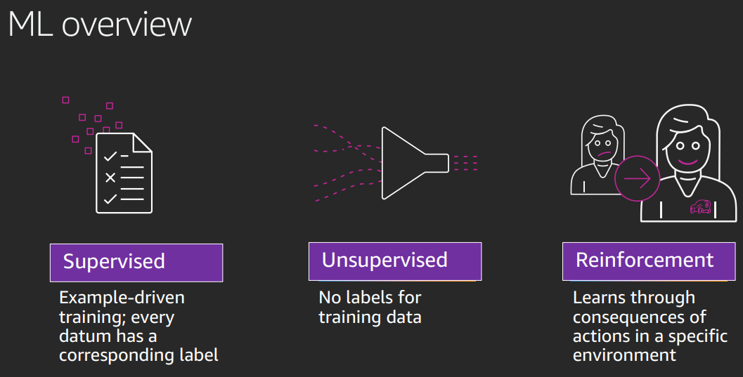 Supervised: data has labels Unsupervised: no explicit lables. Reinforcement: learn through outcome of action