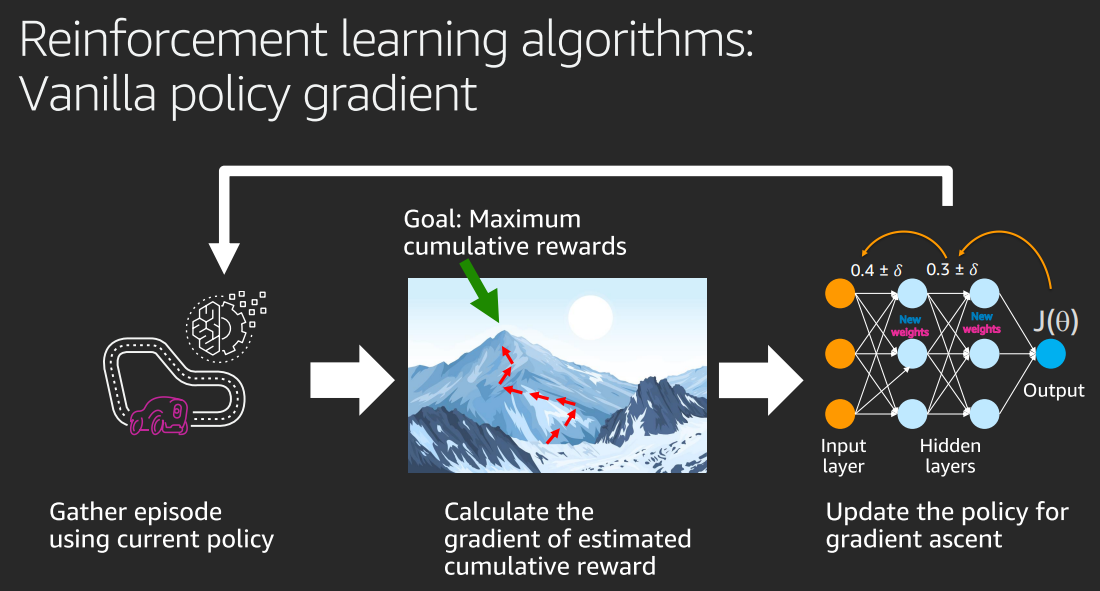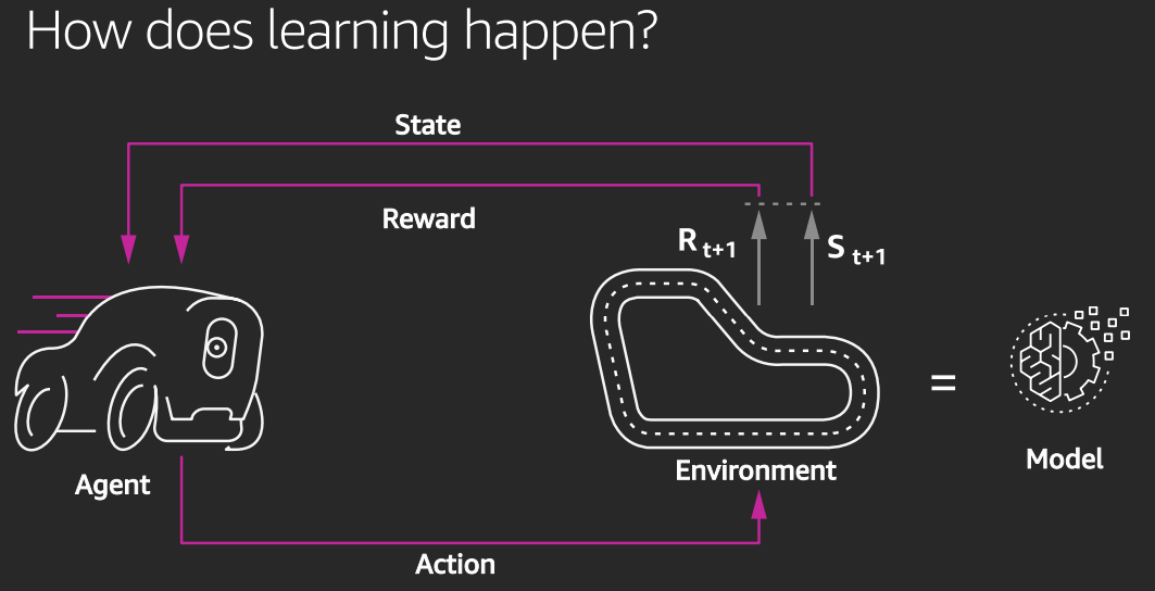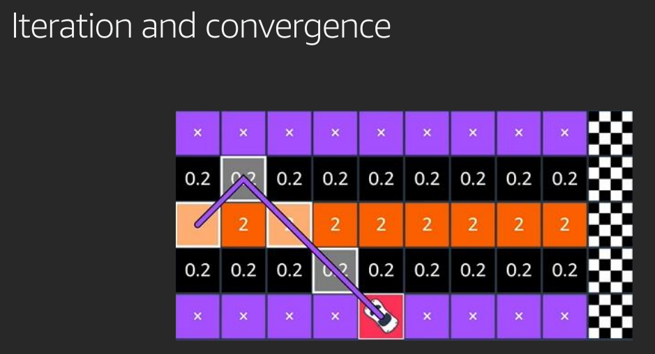 State is current square. Reward function is logic which looks at next state. Iterates to test the reward function to build up knowledge. Higher reward for the centre line. If explore too much, no convergence. too little and convergence not good. policy function to expect the next outcome Aiming for max cumulative rewards