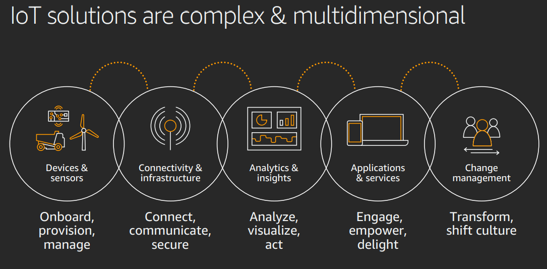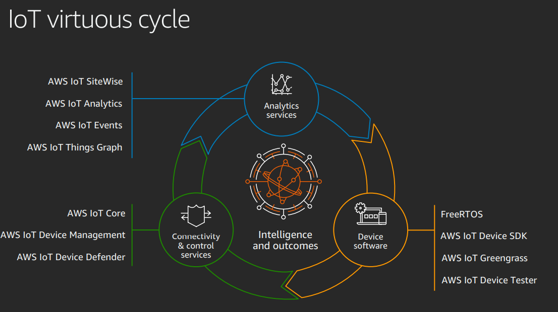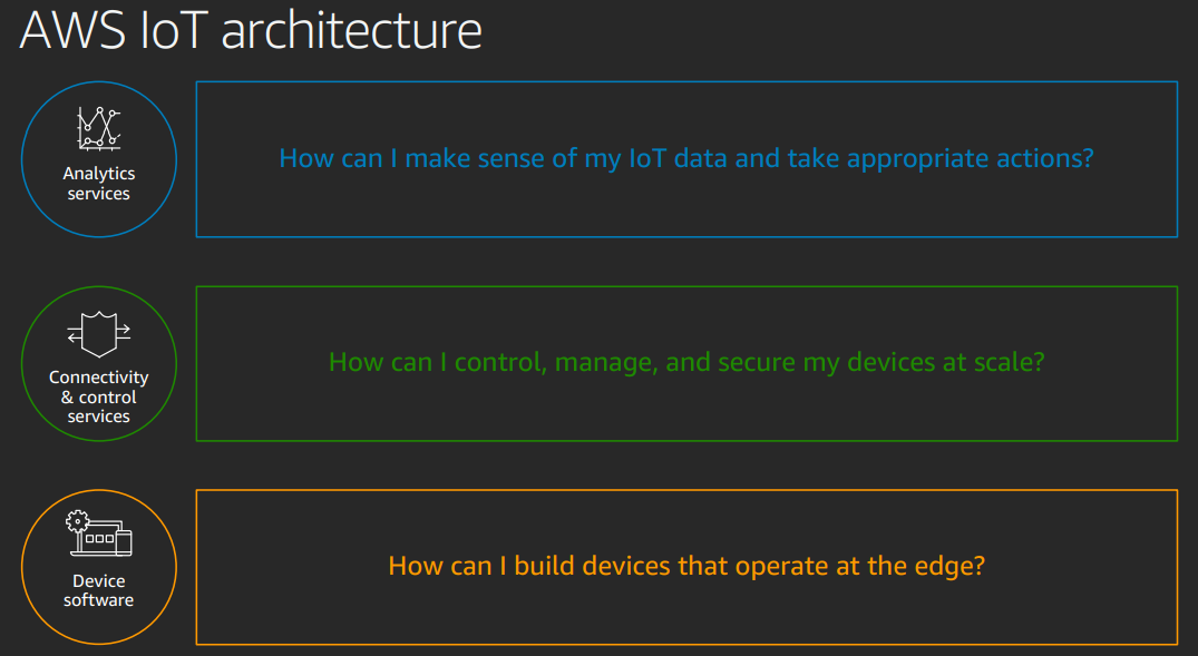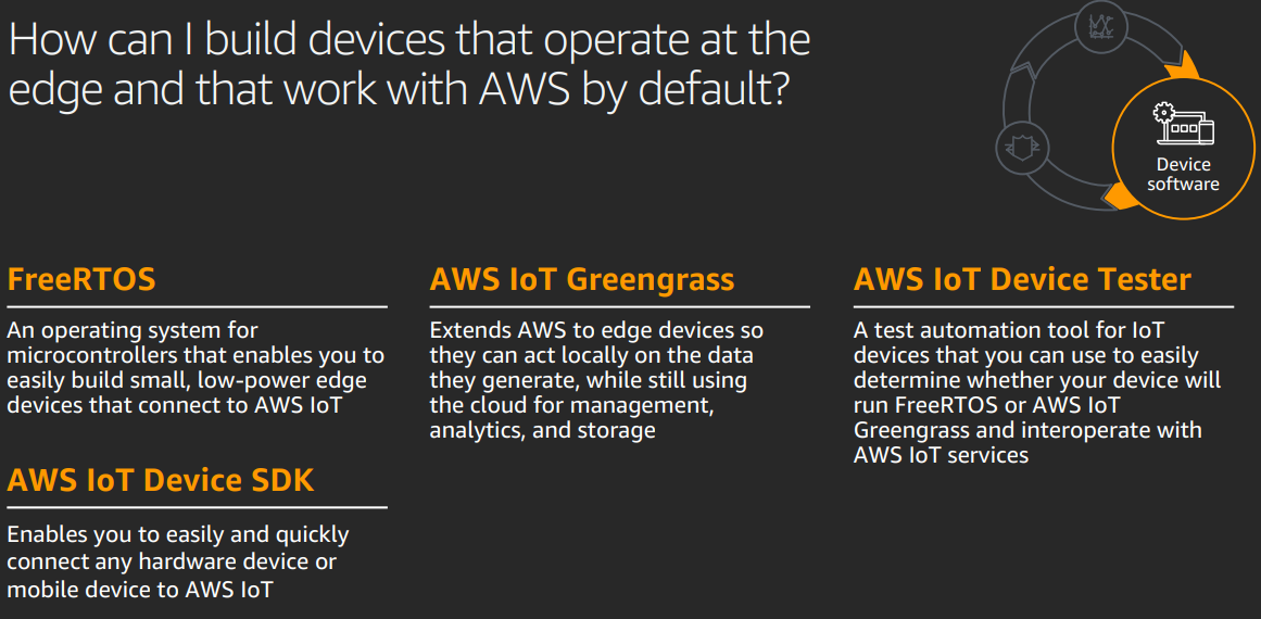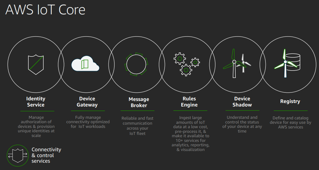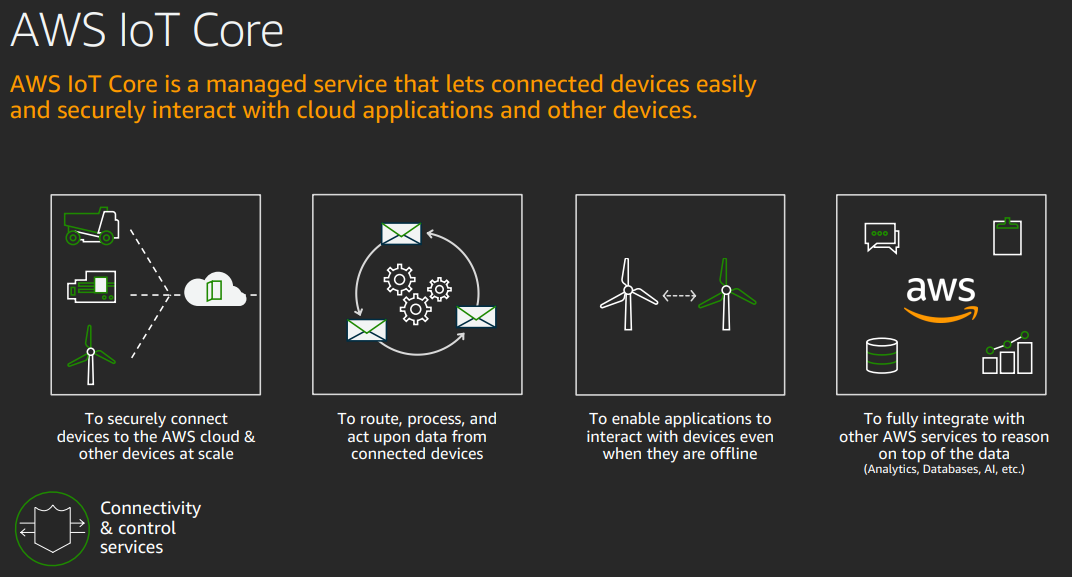 AWS IOT core: does basic connectivity to cloud: connect, secure, scale. Route, rules. Allows to integrate with other services. SDK to extend. Rules engine to filter the information coming from IoT, or respond to events.