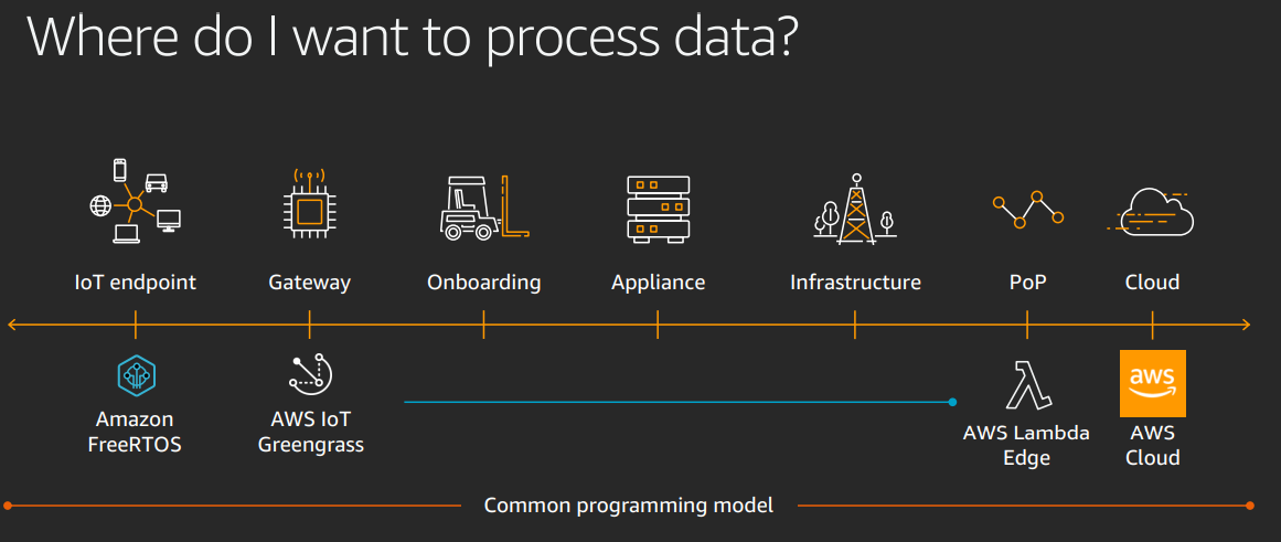 Cloud is cheapest and most available cpu power, not really available at the edge. RTOS: microcrontroller op system. AWS IOT Greengrass for microprocessors, or AWS IOT SDKs to provide connection between AWS and your own software.