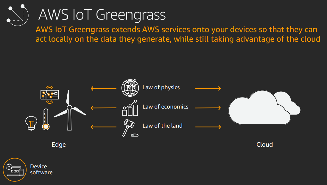 Greengrass: Brings cloud capabilities to the edge. Means can process locally to meet the limitations. Allows reconnection, TLS security, local lambda functions etc. All kinds of connectors. ML inference. Container support (docker).